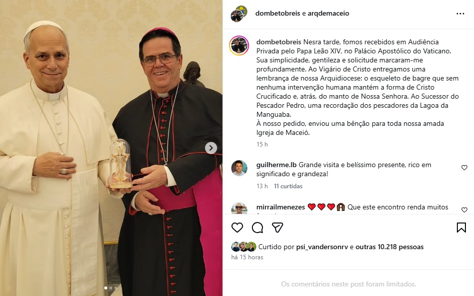 O Arcebispo de Maceió, Dom Beto Reis, visitou o Papa Leão XIV nessa segunda-feira (12), participando de uma audiência privada no Palácio Apostólico, residência oficial do pontífice na Cidade do Vaticano. Durante o encontro, o religioso entregou ao Papa uma lembrança simbólica de Alagoas.