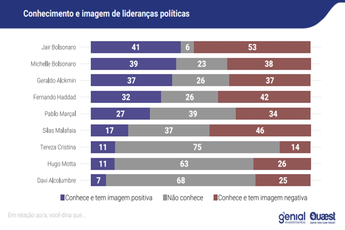 O estudo também aponta altos índices de rejeição a outras figuras públicas. Entre os eleitores que afirmam conhecê-lo, o pastor Silas Malafaia registra 46% de avaliação negativa. Em seguida aparece o ministro da Fazenda, Fernando Haddad, com 42%. Michelle Bolsonaro ocupa a quarta posição, com 38% de imagem negativa.