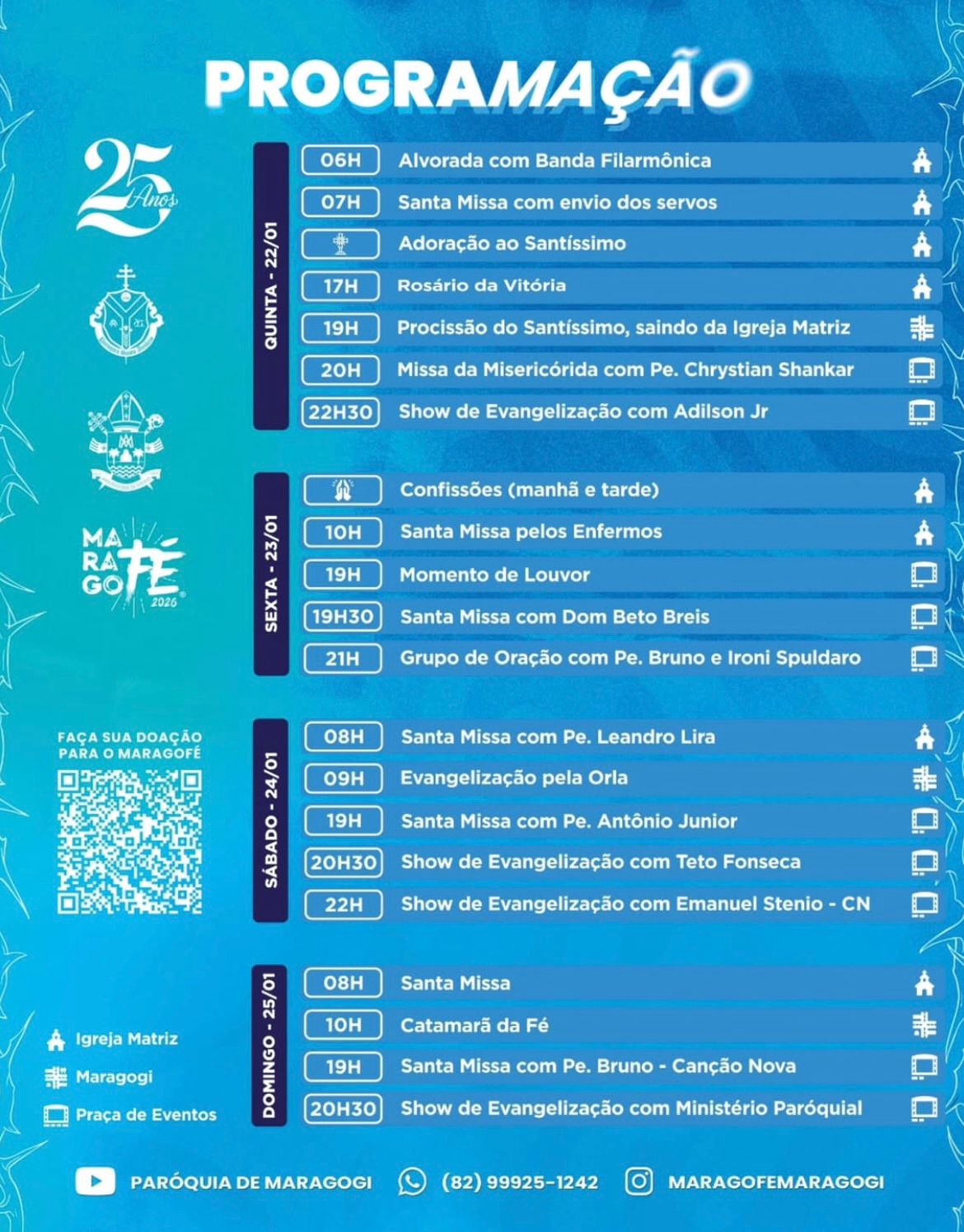 Entre os dias 22 e 25 de janeiro, o município de Maragogi sediará uma edição histórica do Maragofé, que celebra 25 anos de realização e se consolida como um dos mais importantes eventos de fé e evangelização da região. O encontro será realizado na praça de eventos, na orla marítima do município, reunindo fiéis, famílias e visitantes para quatro dias de intensa espiritualidade, louvor, celebração e profunda vivência cristã.