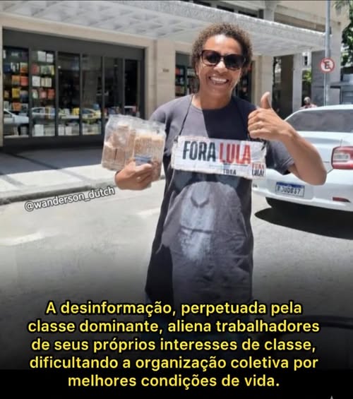 Essa trabalhadora não é empresária, não é elite, não é dona de meios de produção. Ela depende da circulação de pessoas, de renda mínima, de políticas públicas que garantam consumo, saúde, transporte e dignidade. Ainda assim, repete um discurso que historicamente serve aos interesses de quem nunca precisou vender doce na rua para sobreviver. A desinformação cumpre exatamente esse papel. Afasta o trabalhador da compreensão dos próprios interesses de classe e o convence a lutar contra fantasmas cuidadosamente construídos.