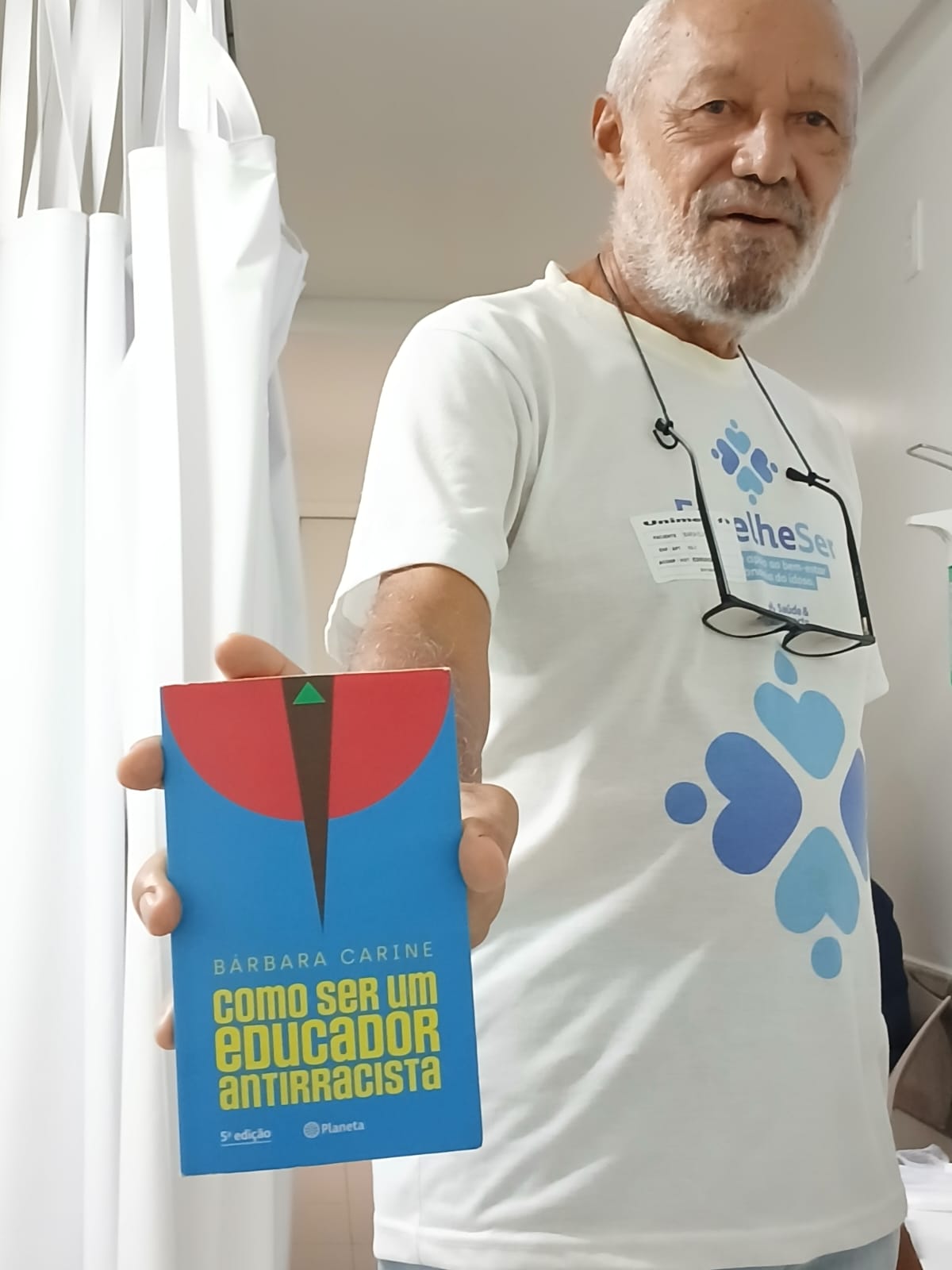 Fiquei em um estado de involução de palavras, até o Edmundo, marido de Valda entrar e mostrar seu novo objeto de leitura, o livro ‘Como Ser um Educador Antirracista’, da professora Barbara Carine.