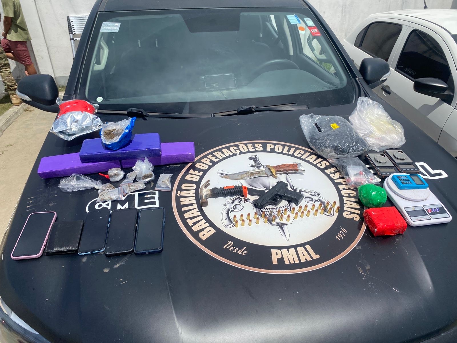 Ao chegarem ao endereço indicado, os policiais foram autorizados a entrar e iniciar as buscas. Durante a ação, além das drogas, foram apreendidos três baldes com plantas de maconha, um simulacro de pistola, 30 munições calibre .380, três balanças de precisão e quatro celulares.