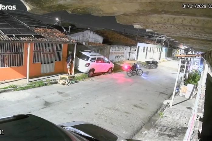As imagens mostram o suspeito chegando ao local em uma motocicleta, que é parada no meio da rua. Em seguida, ele desce do veículo e passa a observar as casas da via, além de um carro estacionado nas proximidades, demonstrando comportamento suspeito.
