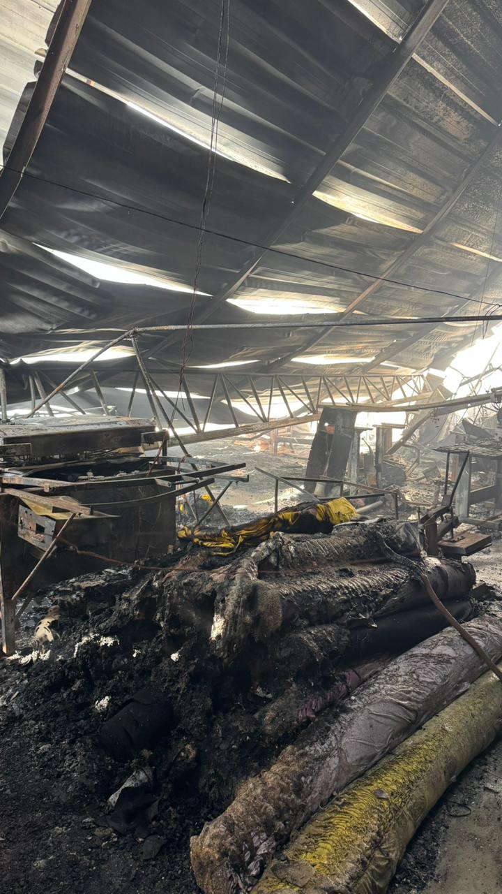 Em um dos registros, é possível ver o corredor interno tomado por fumaça densa enquanto bombeiros avançam com mangueiras para conter o fogo. Em outro ponto da fábrica, rolos de tecido ficaram completamente consumidos pelas chamas, reduzidos a montes enegrecidos.