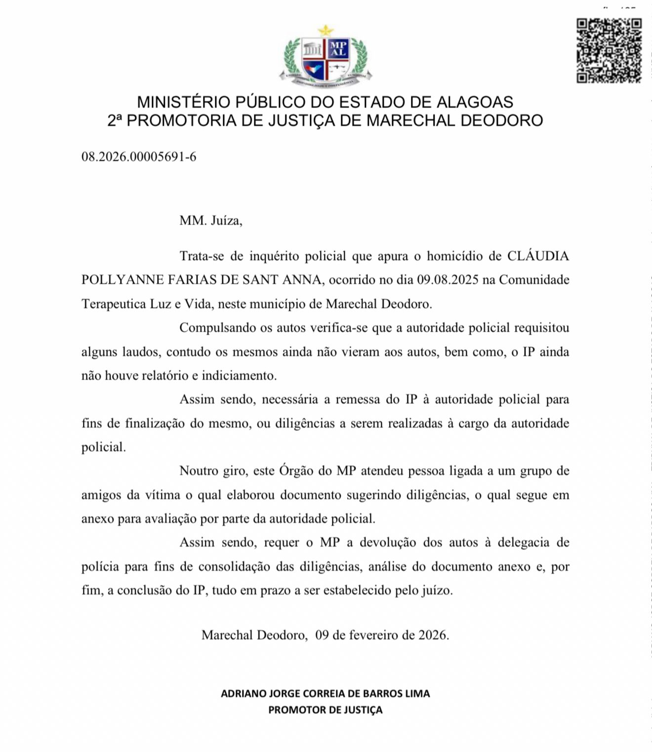 Com a determinação judicial, a Polícia Civil terá 15 dias para complementar a investigação, anexando os laudos requisitados e suprindo as omissões indicadas pelo MPAL. Após esse prazo, o Ministério Público analisará o material e decidirá se mantém o indiciamento por homicídio doloso ou se requisita novas diligências.