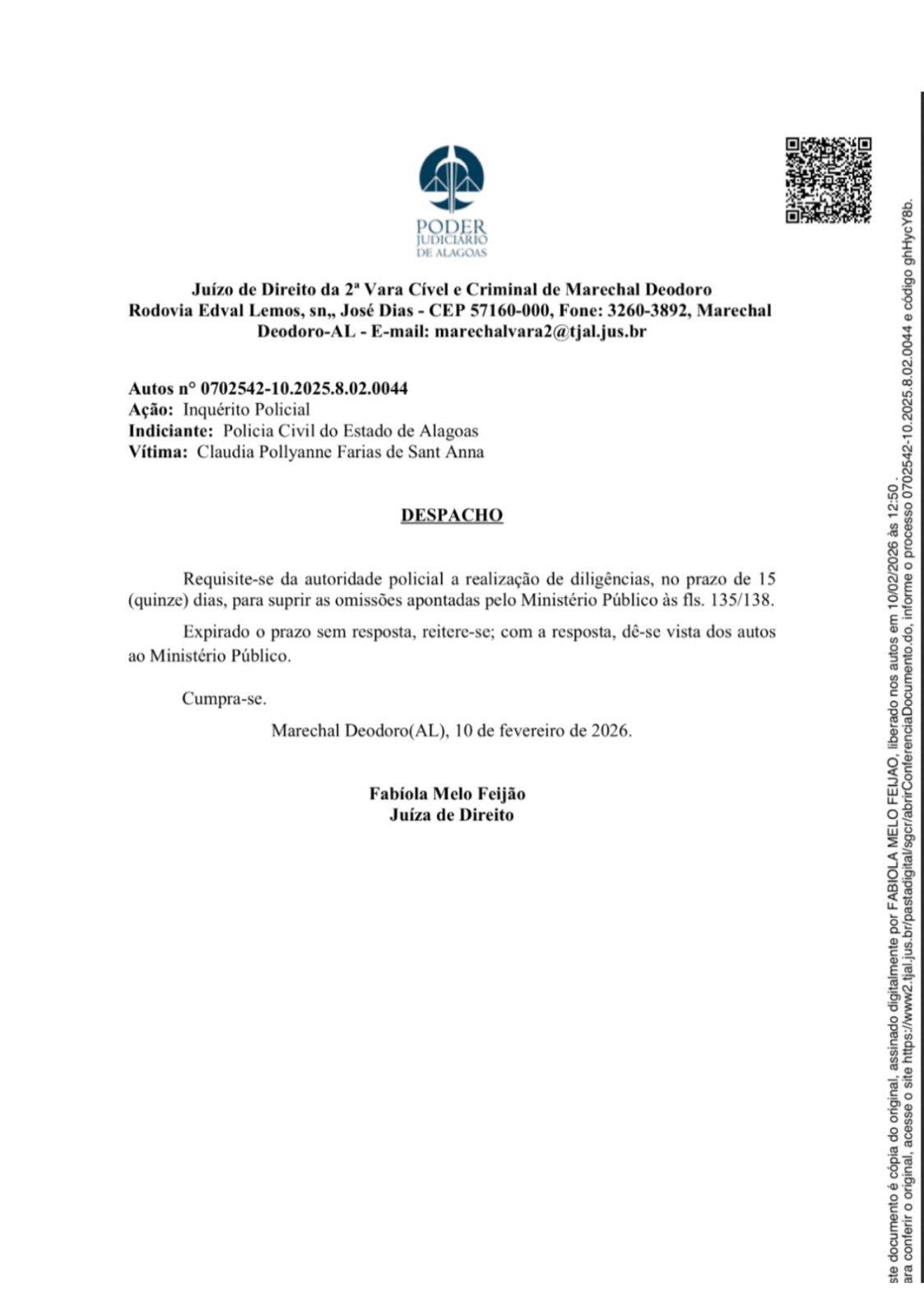 No despacho, a juíza Fabíola Melo Feijão ordena que a autoridade policial realize as diligências no prazo estipulado e, caso não haja resposta, reitere a solicitação. Com as informações encaminhadas, o processo será novamente submetido ao MPAL para avaliação. Confira: