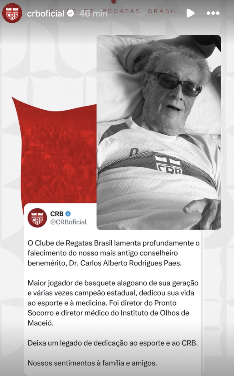 Carlos Alberto Rodrigues Paes, conselheiro benemérito mais antigo do Clube de Regatas Brasil (CRB), morreu nesse sábado (14) . O clube divulgou nota oficial lamentando a perda. A causa do falecimento ainda não foi informada.