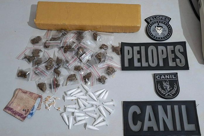 Diante da situação de flagrante delito, foi realizada a devida abordagem e averiguação. No decorrer das buscas no interior da residência, o cão farejador apresentou mudança de comportamento, indicando a presença de entorpecente no quintal. Na verificação, os policiais localizaram o tablete de maconha escondido e uma lona. A mulher assumiu a propriedade das substâncias e foi encaminhada à Central de Polícia Civil.