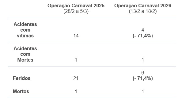 A Polícia Rodoviária Federal (PRF) encerrou nesta quarta-feira (18) a Operação Carnaval 2026 em Alagoas, com destaque para a redução de acidentes em comparação ao mesmo período do ano passado. Nos cinco dias de fiscalização, foram registrados 4 acidentes com 6 feridos e 1 acidente fatal, uma queda de mais de 70% em relação ao Carnaval de 2025, que contabilizou 14 acidentes graves, 21 feridos e 1 morte.