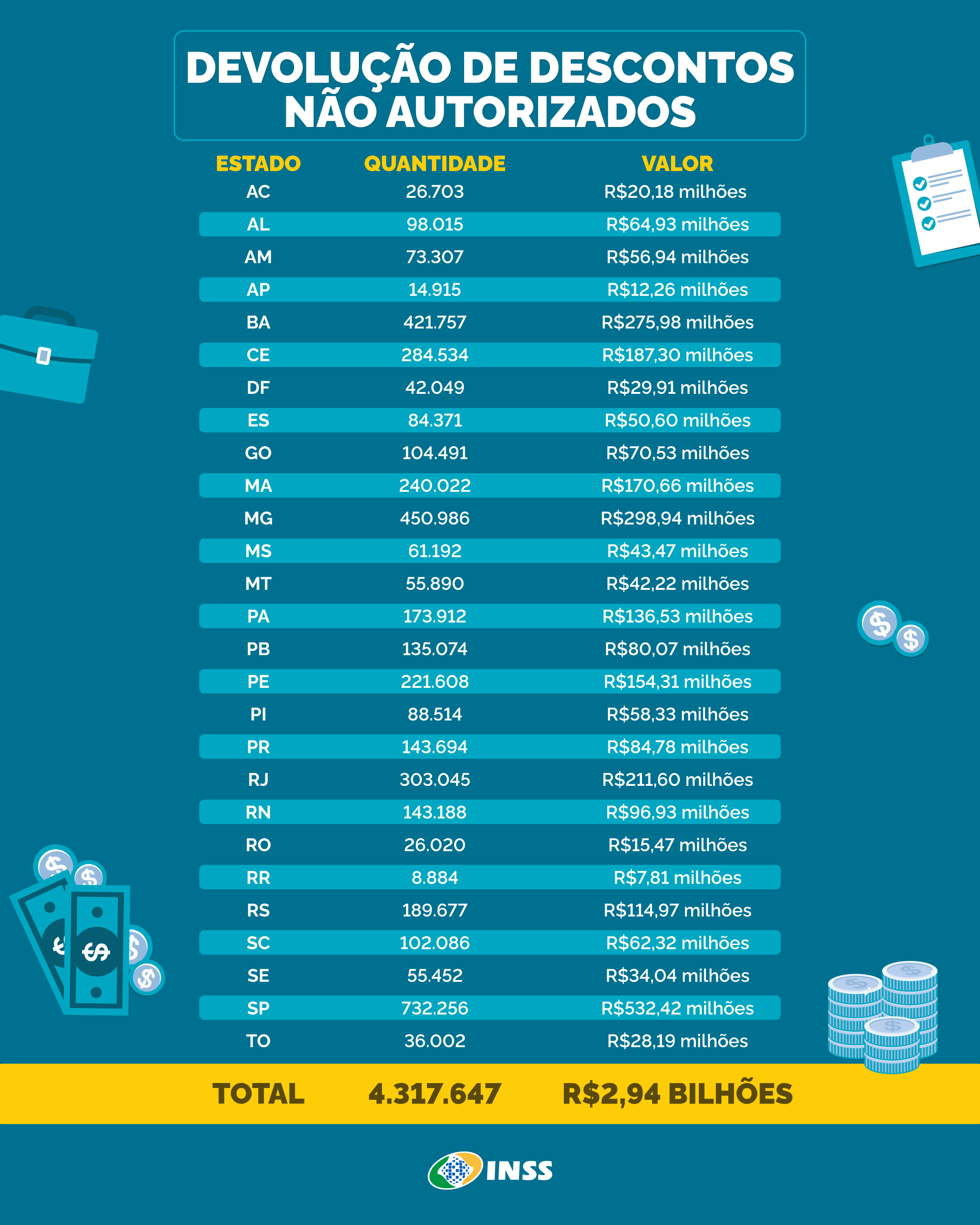 Aposentados e pensionistas de Alagoas já receberam R$ 64,93 milhões em devoluções de descontos associativos não autorizados nos benefícios do Instituto Nacional do Seguro Social (INSS). No estado, 98.015 segurados foram ressarcidos até agora.