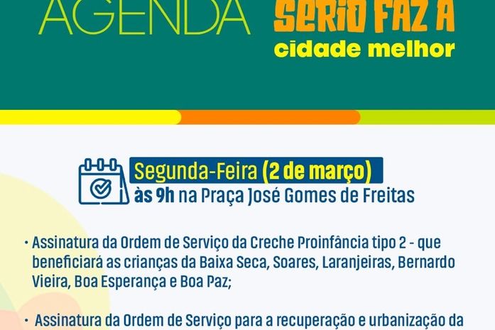 - Assinatura da Ordem de Serviço da Creche Proinfância tipo 2 - que beneficiará as crianças da Baixa Seca, Soares, Laranjeiras, Bernardo Vieira, Boa Esperança e Boa Paz;