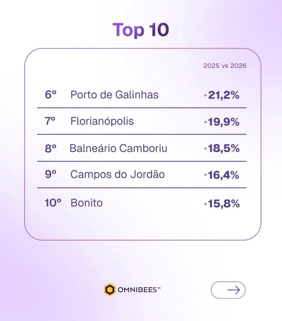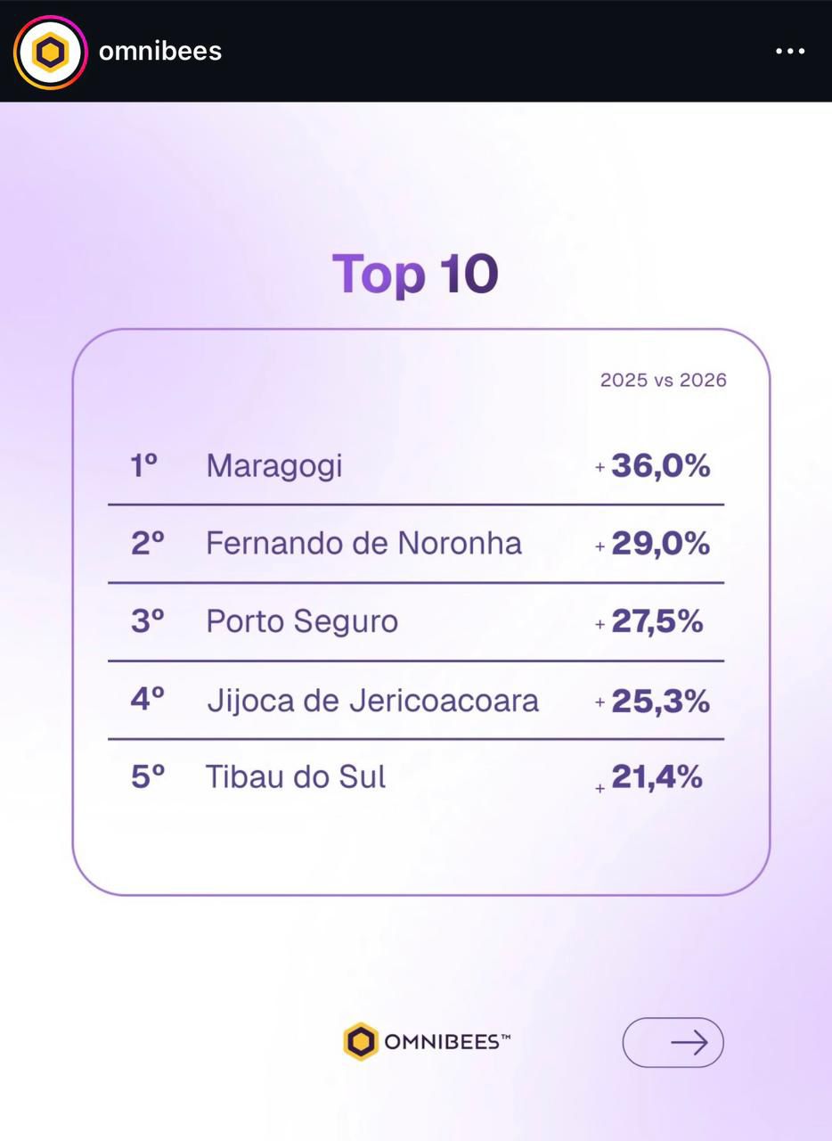Dentro desse contexto positivo, Maragogi foi o grande protagonista do Carnaval 2026. O destino alagoano liderou o ranking nacional de crescimento em reservas, com expressivo avanço de +36% em relação ao ano anterior — o maior percentual entre todos os destinos analisados no Top 10 Brasil. O desempenho reforçou sua posição de destaque no cenário turístico e evidenciou sua crescente atratividade para o período carnavalesco.