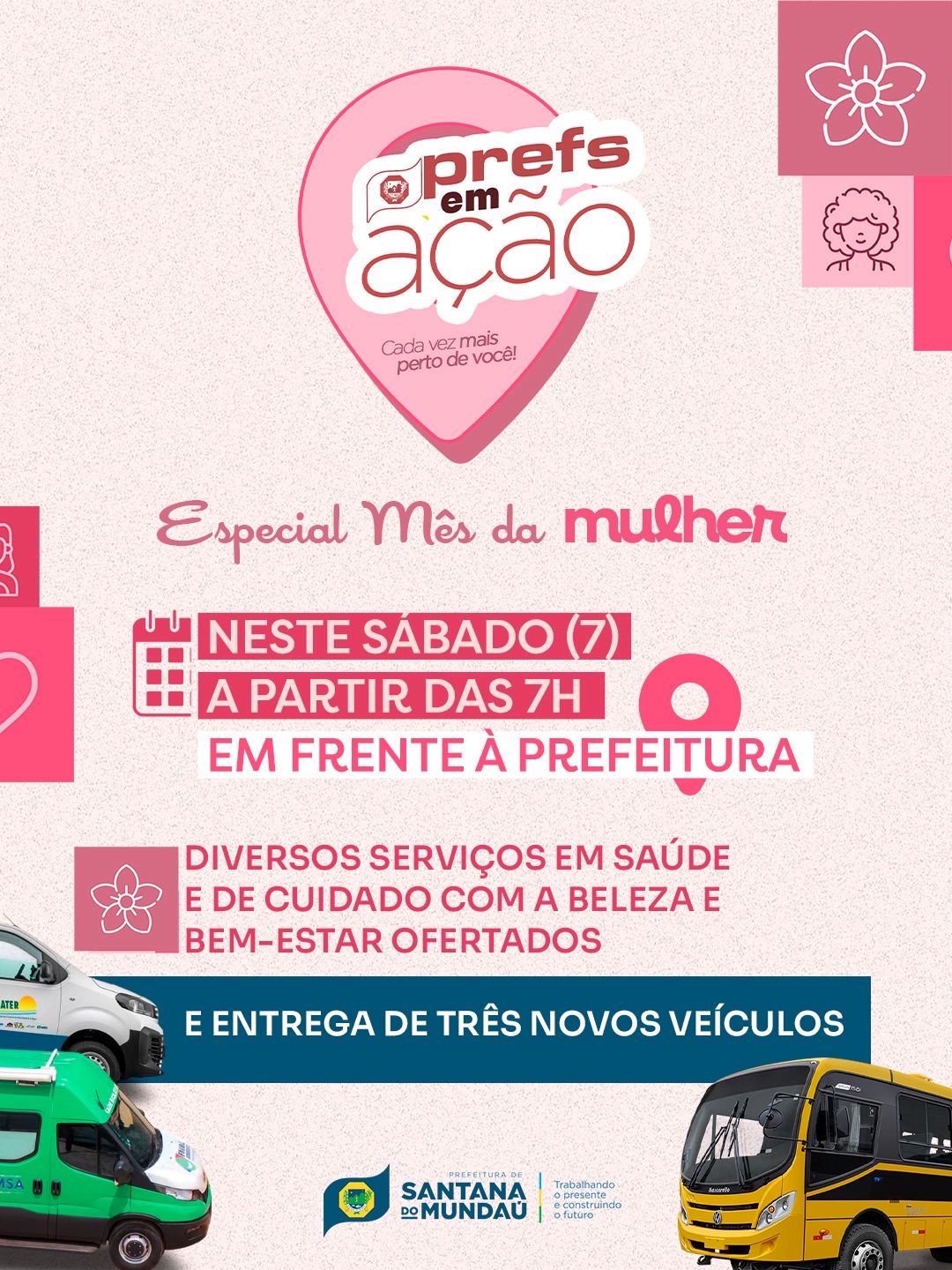 Em comemoração ao mês da mulher, a prefeitura de Santana do Mundaú realizará no próximo sábado (7), mais uma edição do Prefs em Ação, uma iniciativa que oferta, de forma simultânea, diversos serviços de saúde e cuidados com a beleza e bem estar.