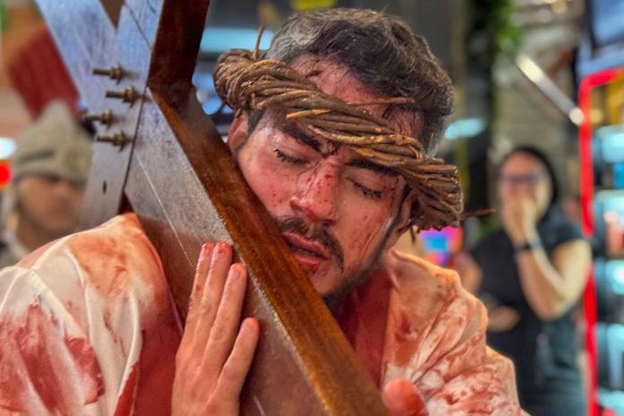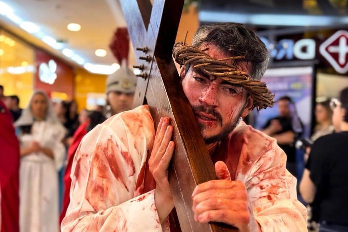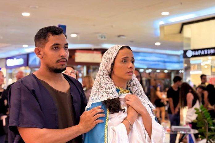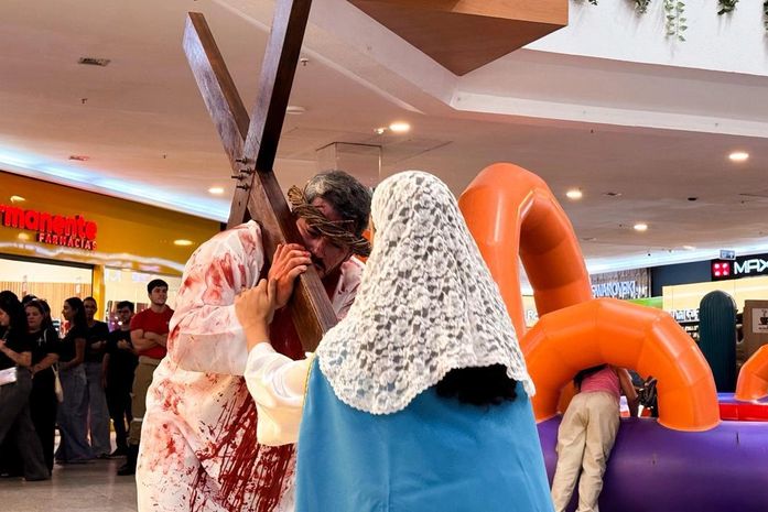 No último domingo (8), quem passou pelos corredores de um shopping localizado no bairro Mangabeiras, em Maceió, foi surpreendido por um momento de fé, emoção e reflexão. Jovens da Paróquia Divino Espírito Santo, do bairro da Jatiúca, realizaram uma pequena demonstração da tradicional encenação da Via-Sacra, chamando a atenção do público e proporcionando um instante de silêncio e espiritualidade em meio ao movimento do centro de compras.