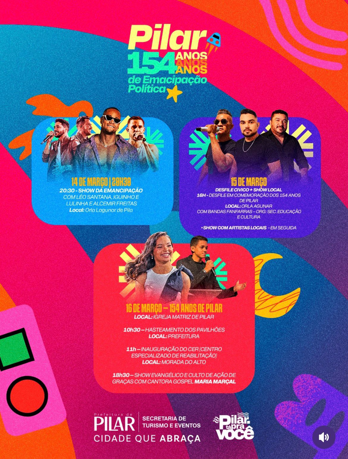 A Prefeitura de Pilar realiza, entre os dias 12 e 17, a programação em comemoração aos 154 anos de emancipação política do município, reunindo uma agenda cultural com grandes atrações nacionais e uma série de entregas e investimentos em áreas fundamentais para a população, como educação, esporte, saúde e lazer. A celebração combina festas com inaugurações, assinatura de ordens de serviço e ações sociais.