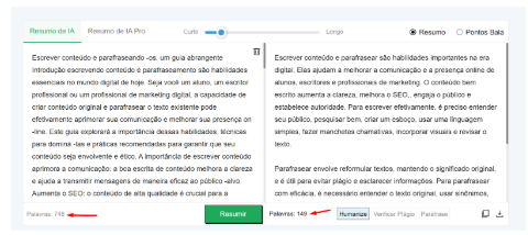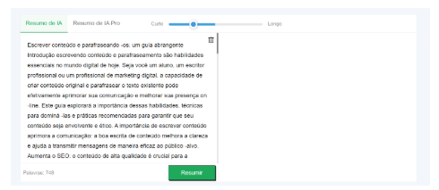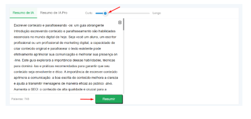 No entanto, recomendamos não optar por ajustes muito concisos. Isso impedirá que a ferramenta execute o processo de sumarização adequadamente, resultando em uma saída com qualidade comprometida.