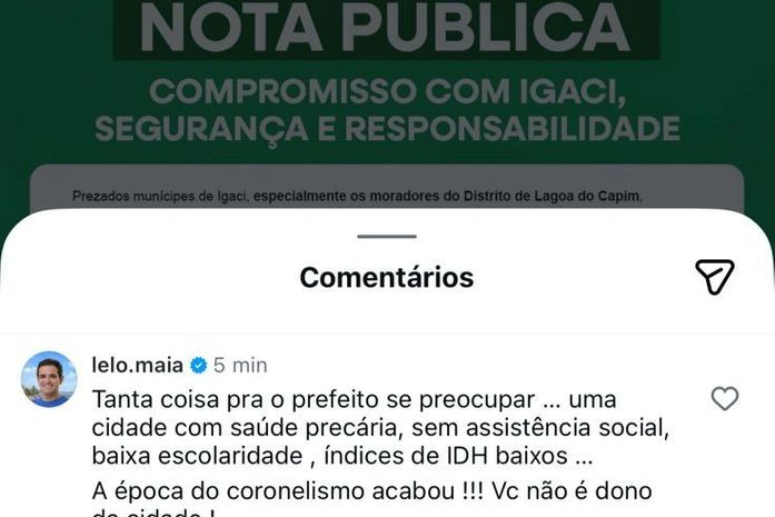 Em resposta, Lelo Maia comentou na própria publicação do perfil oficial da prefeitura e criticou a decisão da gestão municipal.