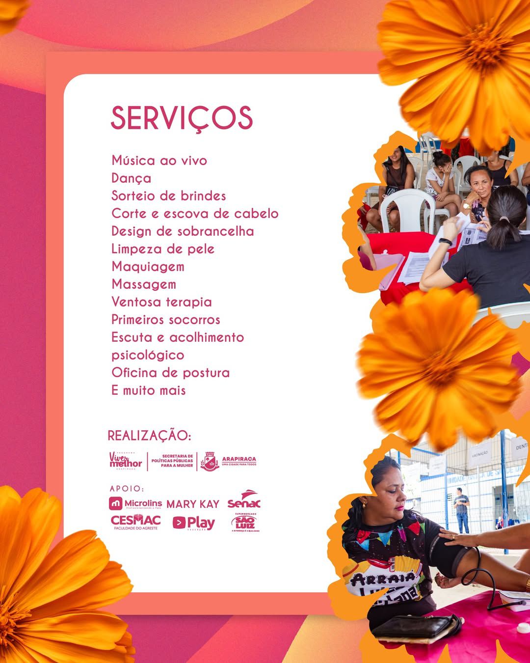 Diversos serviços serão ofertados para celebrar a força das mulheres, um cuidado a quem sempre cuida. A ação terá sorteio de brindes, corte e escova de cabelo, design de sobrancelhas, limpeza de pele, maquiagem, massagem, dança, oficina de postura, escuta e acolhimento psicológico. Tudo isso com muita música ao vivo.
