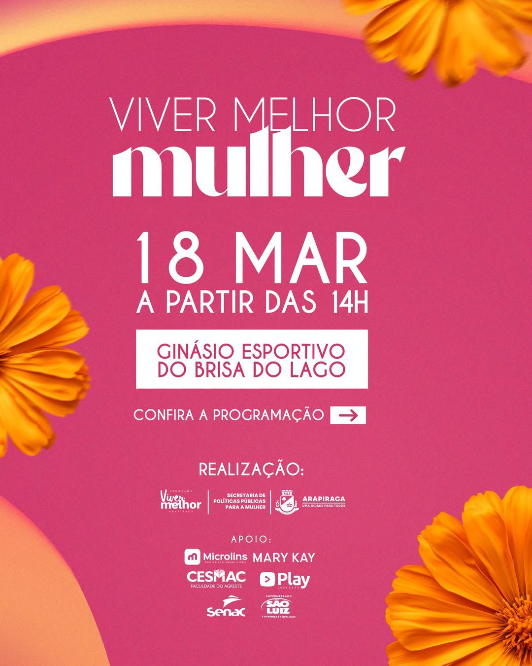 A Prefeitura de Arapiraca, por meio do Programa Viver Melhor e a Secretaria de Políticas Públicas para Mulheres, preparou uma tarde muito especial para as mulheres do Residencial Brisa do Lago. O Viver Melhor Mulher acontece nesta quarta-feira (18), a partir das 14h no ginásio esportivo da comunidade.