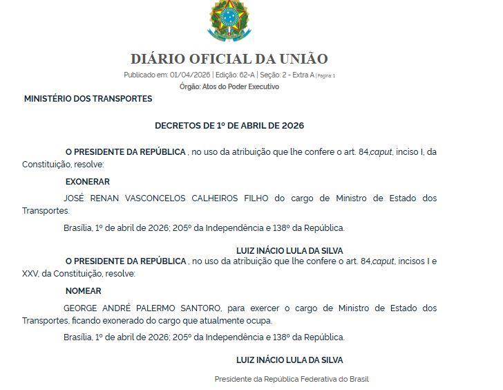 O ministro dos Transportes, Renan Filho, foi exonerado do cargo nesta quarta-feira (1º) pelo presidente Luiz Inácio Lula da Silva. A saída faz parte do movimento para se tornar elegível na disputa pelo governo de Alagoas nas eleições deste ano. A decisão foi publicada em edição extra do Diário Oficial da União.
