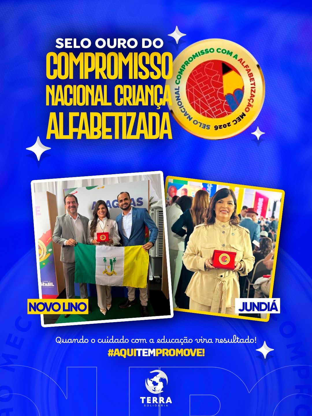 Na segunda-feira (23), em Brasília, cinquenta e três municípios alagoanos foram agraciados com o Selo Ouro do Compromisso Nacional Criança Alfabetizada, entre eles, Novo Lino e Jundiá. Presentes na solenidade conduzida pelo presidente Lula, a prefeita de Novo Lino, Marcela Gomes e o secretário de educação, Paullo Netto; e a secretária de educação de Jundiá, Renan Pereira, reforçaram a importância dos investimentos realizados pelas gestões para alfabetizar as crianças na idade certa, e destacaram a parceria com o Instituto Terra Solidária.