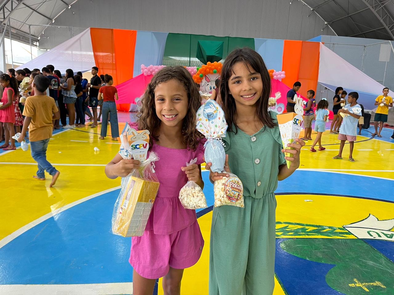 Ovos de chocolate, guloseimas, lanches, brinquedos infláveis e muita diversão fizeram parte da celebração da Páscoa promovida nesta quarta-feira (1), pela Prefeitura de Santana do Mundaú, através da Secretaria de Assistência Social, para cerca de 300 crianças dos grupos do Serviço de Convivência e Fortalecimento de Vínculos e Programa Criança Feliz.