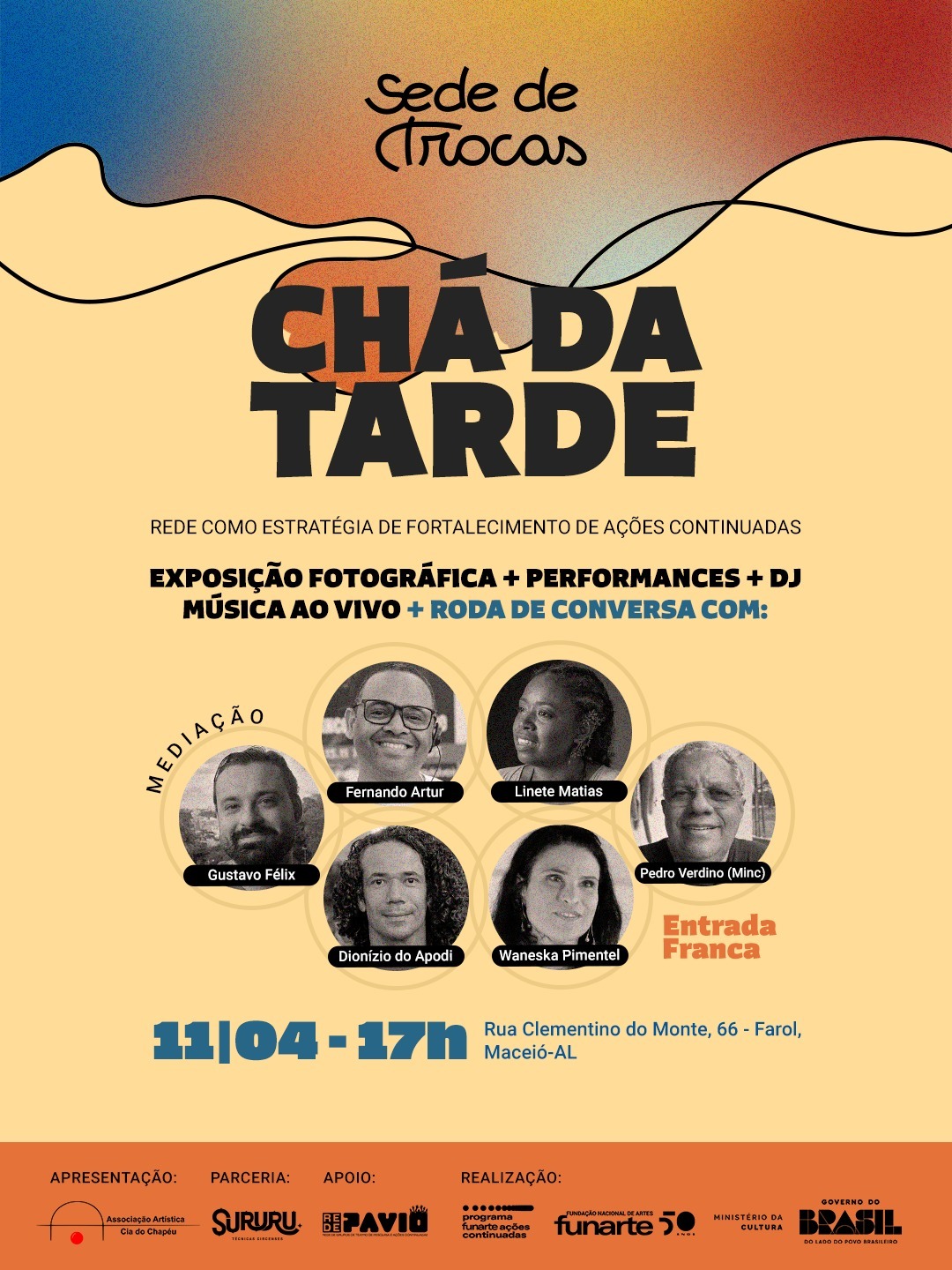 A cena cultural alagoana ganha um novo ponto de encontro no próximo dia 11 de abril. A partir das 17h, a Cia do Chapéu inaugura a Sede de Trocas com a realização do “Chá da Tarde”, reunindo artistas, produtores e o público em geral em uma programação que celebra a convivência e a criação artística.