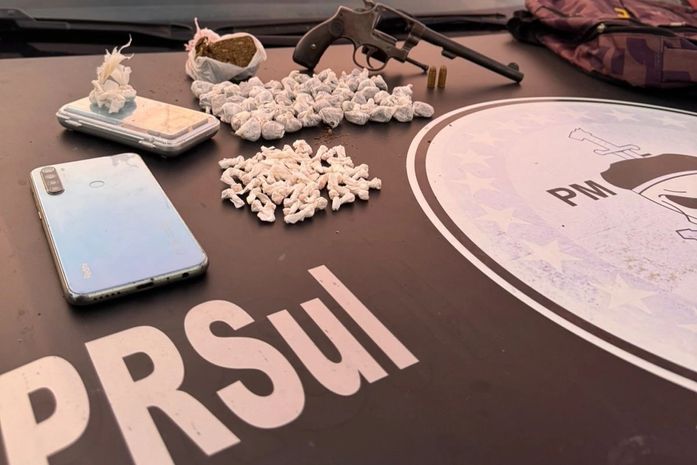 Durante a abordagem, os agentes apreenderam um revólver calibre 32 com duas munições, além de 118 gramas de maconha (divididos em 63 porções), 9 gramas de crack (62 pedras) e 3,5 gramas de cocaína (três porções). Também foram apreendidos uma balança de precisão e um aparelho celular.