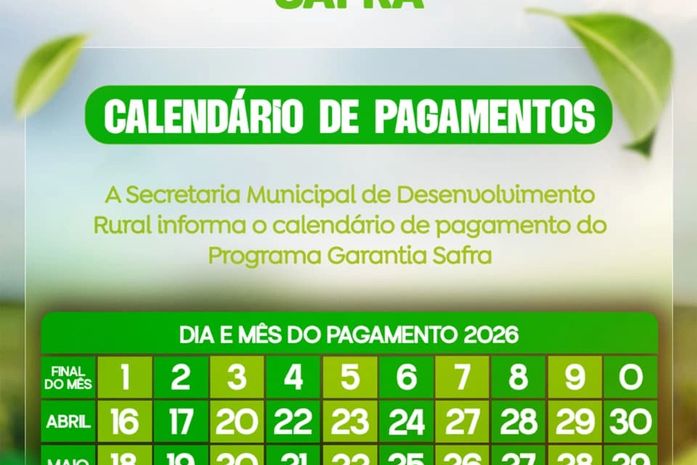 Os agricultores girauenses já podem procurar as agências bancárias da região para realizar o saque do Programa Garantia Safra 2026. O município, por meio da Secretaria Municipal de Agricultura, Pecuária e Recursos Hídricos, em parceria com o Governo Federal, divulgou o calendário de pagamentos, que começa nesta quinta-feira (16). Os trabalhadores rurais devem ficar atentos à numeração final da conta digital no aplicativo Caixa Tem para não perder o prazo e garantir o recebimento do benefício conforme o calendário oficial.