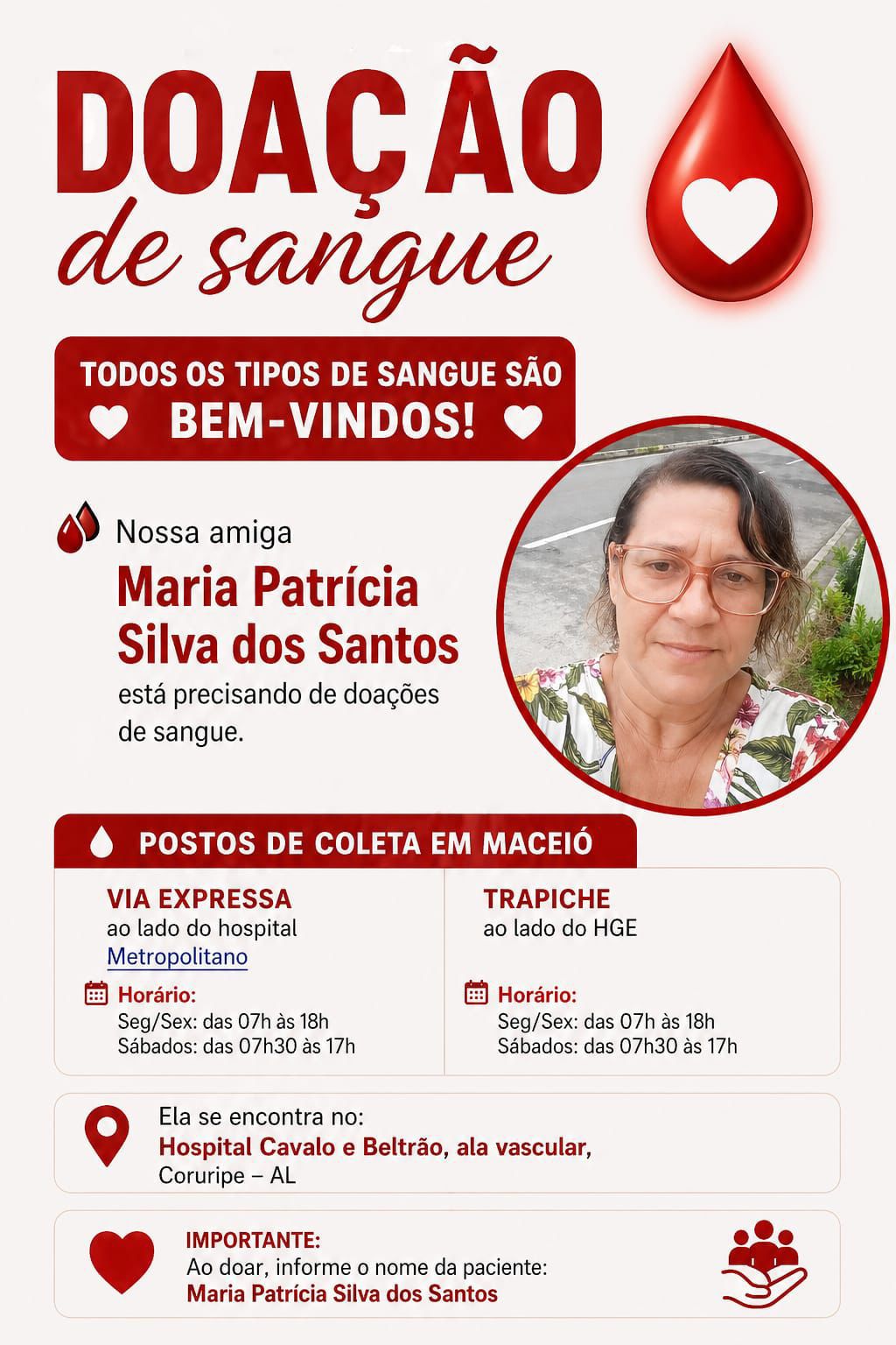 Segundo a família, Maria Patrícia enfrenta uma infecção bacteriana aguda da pele, que evoluiu mesmo com acompanhamento médico. Diante da situação, ela precisou passar por um procedimento cirúrgico para retirada de tecido comprometido. Além disso, já apresentava um quadro de anemia, o que aumentou a necessidade de transfusões.