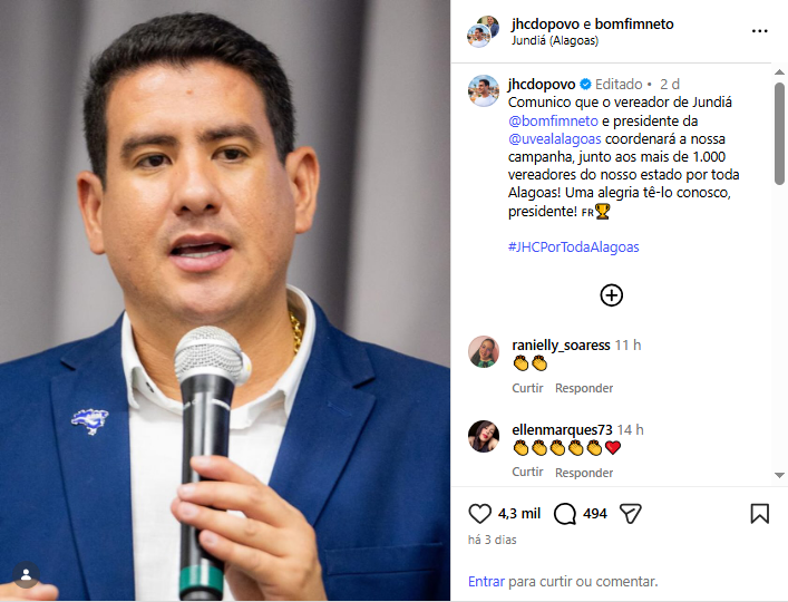 O posicionamento ocorre após o ex-prefeito de Maceió, JHC (PSDB), anunciar em suas redes sociais que o presidente licenciado da Uveal, Neto Bomfim (PSB), seria o coordenador de sua campanha ao Governo de Alagoas, atuando junto aos mais de mil vereadores do estado.